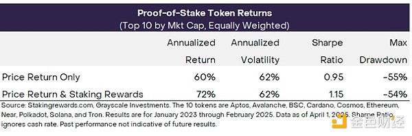 图表 2 展示了这两个指数的回报统计数据。纳入质押奖励后,总回报率从 60% 提升至 72%,这意味着实际年回报率为 12%。质押奖励不会导致价格波动(尽管质押可能会带来其他风险;请参阅下一段),因此更高的回报也会导致更高的夏普比率。